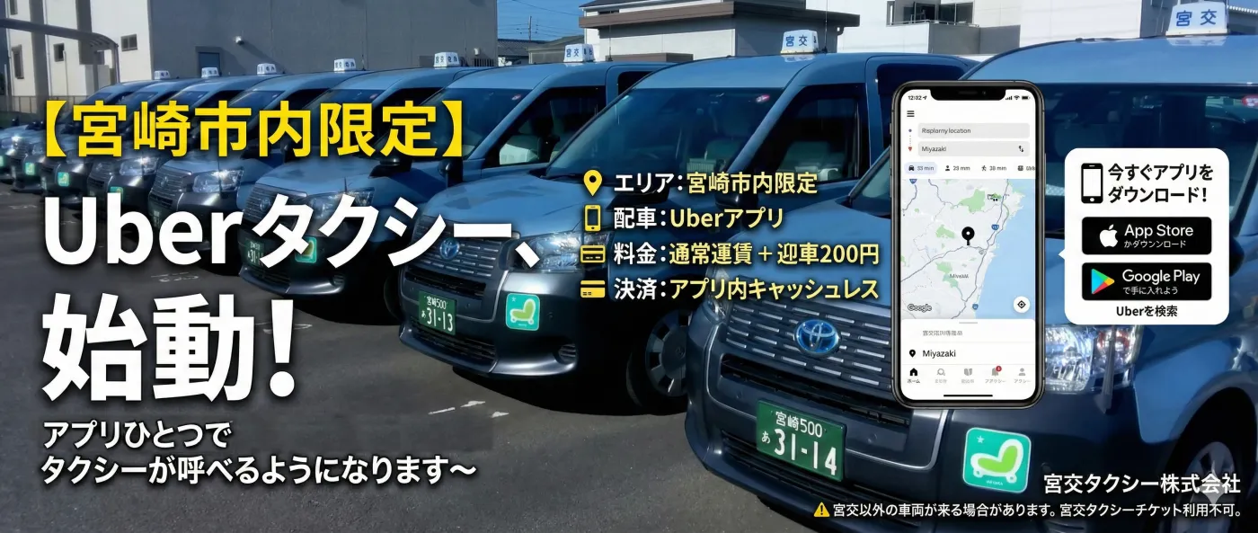 いつも宮交タクシーをご利用いただきまして、誠にありがとうございます。 表題の件、2月1日(日)より、Uberタクシーの運用を宮崎市内限定で始めました。 Uberタクシーとは、タクシーご利用のお客様が、Uberアプ …